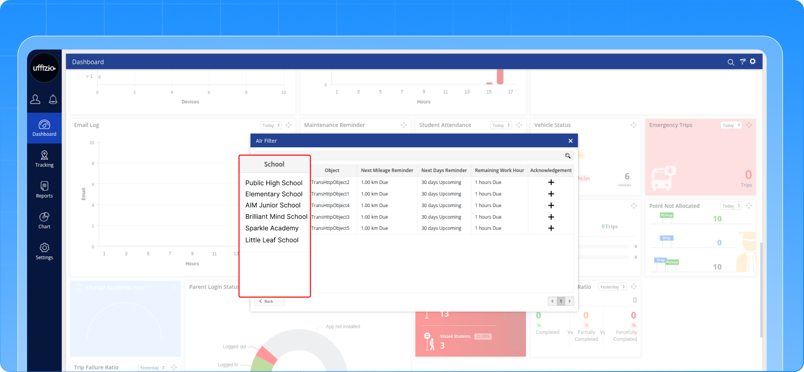 - Clicking the widget shows school-wise vehicle reminder details.
