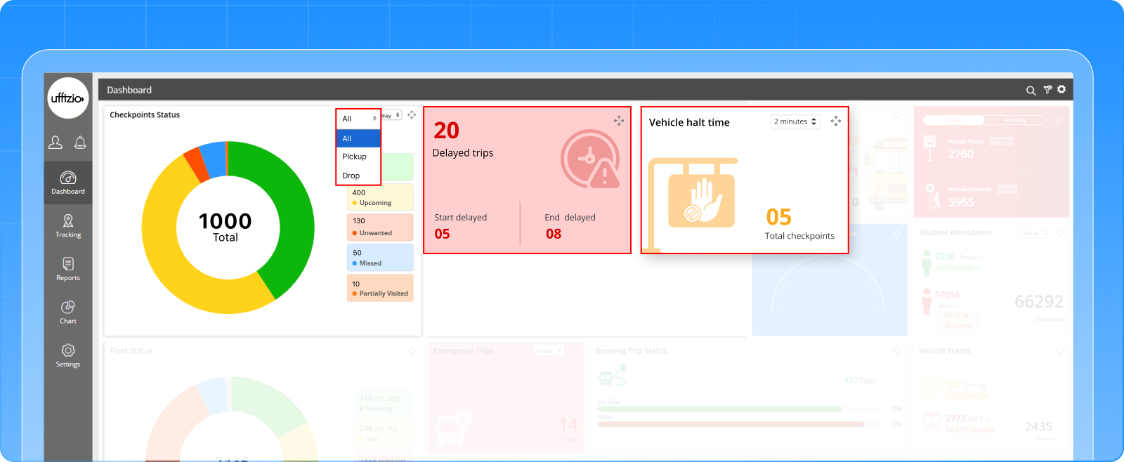 The Checkpoint Status widget now includes a date filter for viewing past records and a trip-type filter for Pick-Up, Drop-Off, or All trips. This helps users understand both current trends and historical performance.
